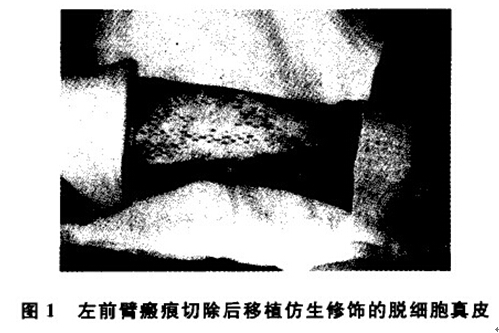 1.2.2 手术方法 (1)观察组:手术完全切除术区瘢痕组织至皮下浅筋膜,严密止血后,将异体成纤维细胞仿生修饰的脱细胞真皮置于手术创面区域内,脱细胞真皮与创面基底紧密贴附(图1),取自体刃厚皮覆盖于脱细胞真皮之上,以丝线将自体皮与脱细胞真皮一同缝合固定于手术切口边缘,生理盐水冲洗皮下,凡士林油纱布覆盖内层,无菌敷料加压包扎固定。(2)对照组:手术创面封闭不用脱细胞真皮,自体皮选择中厚皮片。